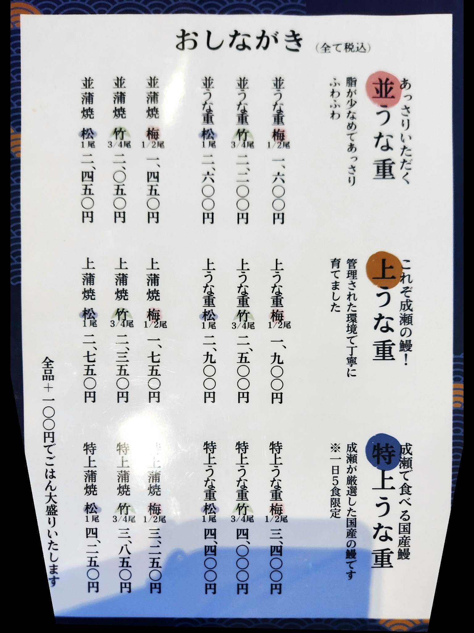 メニューは並うな重、上うな重、特上うな重の3種。